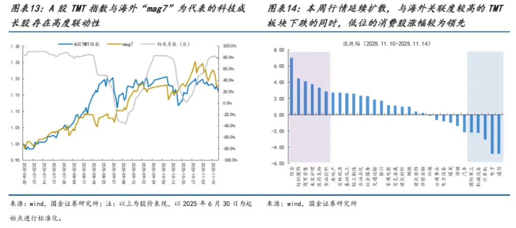 Reflecting on the A-share market: the style continues to rebalance. While core assets, U.S. tech stocks, are hovering, the domestic TMT sector, as their satellite assets, continues to adjust, and the market trend has spread from the previous AI+ and general AI (such as storage and electricity) to low-performing consumer stocks. On one hand, the TMT sector, which is highly correlated with overseas markets, continues to decline, while the amplification of asset price fluctuations has even extended to the electricity sector, causing certain fluctuations in the stock prices of the general AI sector represented by electrical equipment in the latter half of the week On the other hand, consumption, which is highly correlated with the traditional economy and represents pro-cyclical assets, is currently undervalued (which itself implies pessimistic expectations for the fundamentals). During the process of capital rebalancing, there is instead a demand for catch-up.
