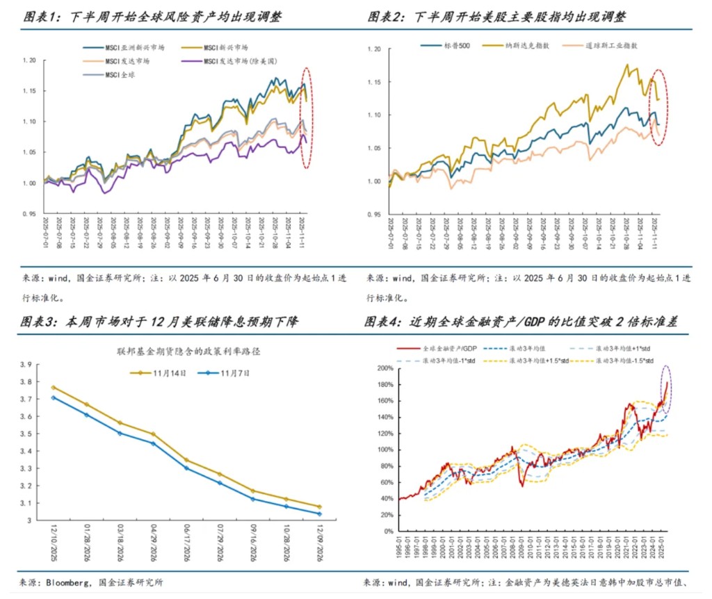 This week, global asset prices have experienced increased volatility, and risk appetite has once again declined. Although the U.S. government has ended its longest shutdown in history, the delayed disclosure of key economic data has left the market in a state of "data deficiency," making it impossible to ascertain the current real economic picture in the U.S. Meanwhile, the hawkish statements from numerous Federal Reserve officials have led the market to a "fifty-fifty" betting state regarding the probability of interest rate cuts in December. For instance, Bloomberg data this week indicated that the implied policy rate from federal funds futures has been adjusted upward. For risk assets, the current ratio of global financial assets to GDP is already at a high level (breaking above 2 standard deviations), and historically, any fundamental changes at this point tend to lead to significant pullbacks in risk assets.