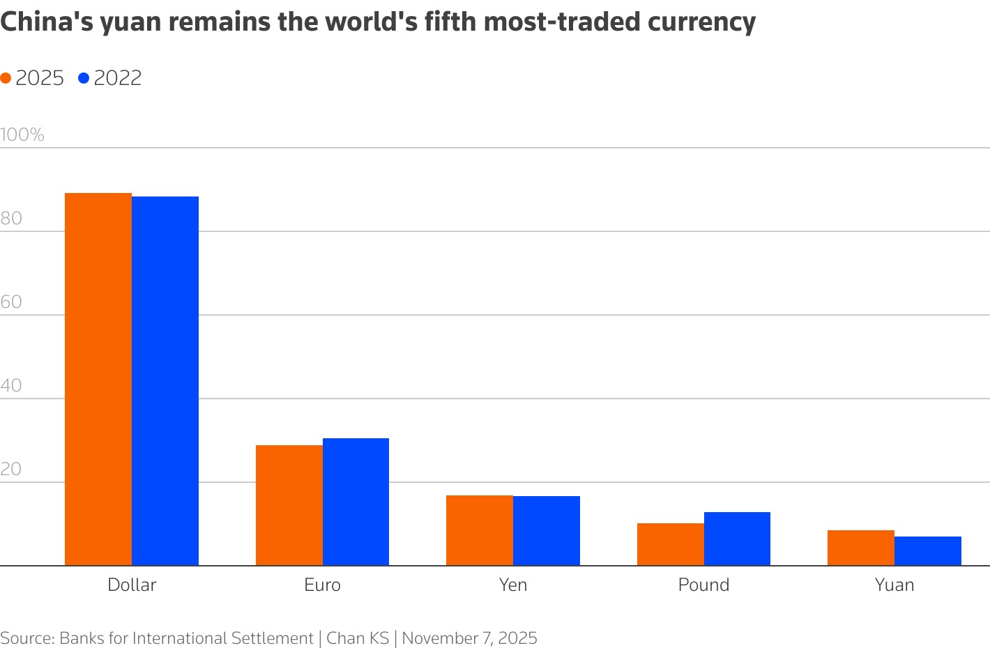 For Beijing, trade settlement will probably be the next area of focus, given China’s 15% share of $33 trillion ofglobal trade by value. Notably, as part of a broader contract dispute, China’s steel industry has stopped purchasing dollar-denominated iron ore from Australia’s BHP (BHP.AX) since October, according to Chinese media, citing sources, and has insisted the mining giant settle 30% of transactions in yuan going forward. Separately, Dutch chipmaker Nexperia’s Chinese unit has demanded all transactions be settled in yuan, Reuters , citing sources, after The Hague seized control of the company’s Netherlands-based parent in September, sparking a broader standoff.