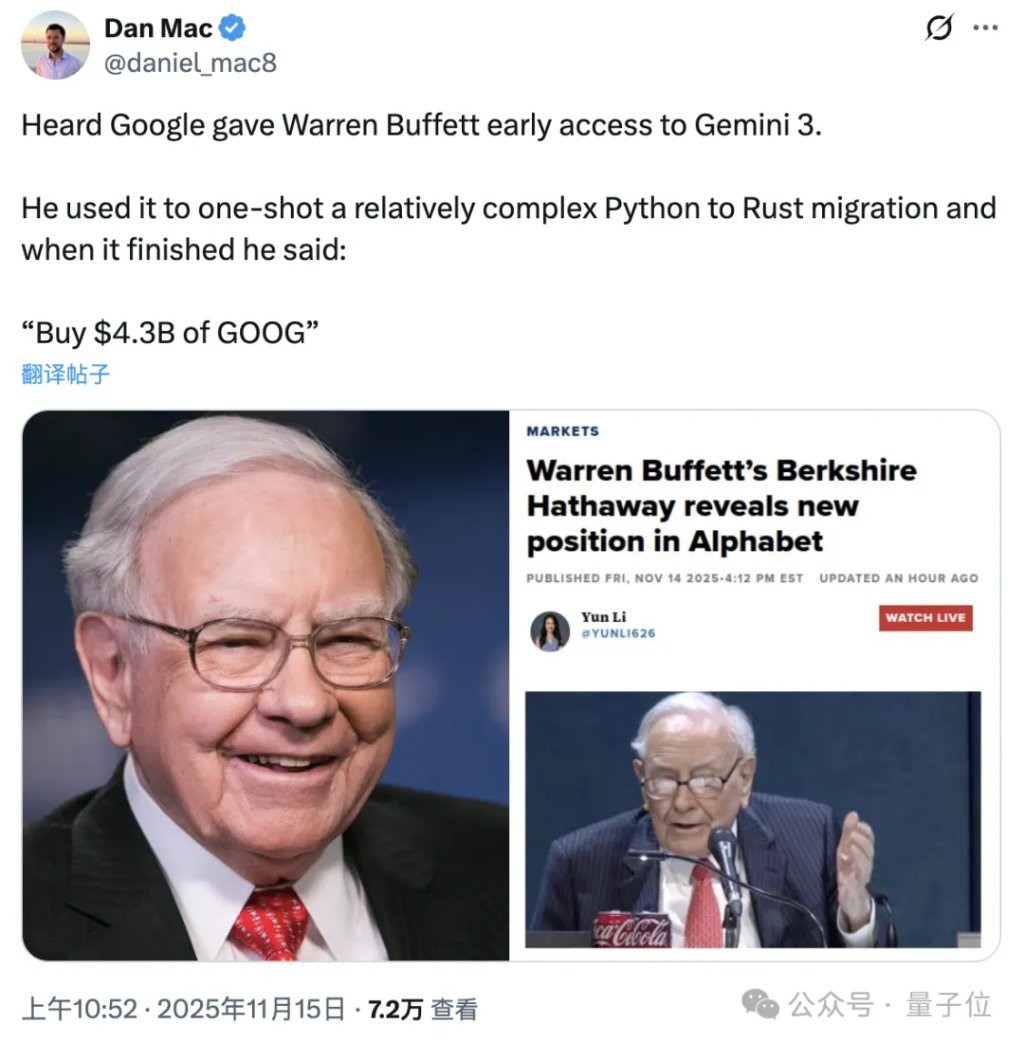 It is rumored that Google allowed him to experience Gemini 3 in advance, and after seeing Gemini 3 complete a complex Python to Rust migration task in one go, he made the decision to heavily invest.