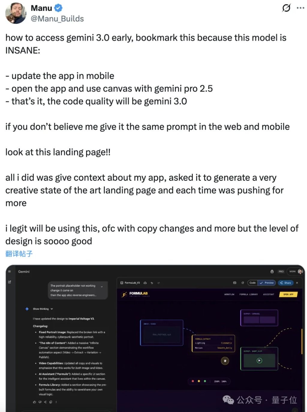 Gemini 3 showcased its powerful features in the "advanced screening," including seamless integration of different games and highly realistic SVG animations. Netizens shared their hands-on experiences, stating that its performance was outstanding. The CEO of Google also retweeted related news, indicating widespread attention. The entry point for Gemini 3 is hidden within the app and requires an update to use the Canvas feature. Its design is beautiful, supports complex interactions, and has attracted a large number of users to try it out