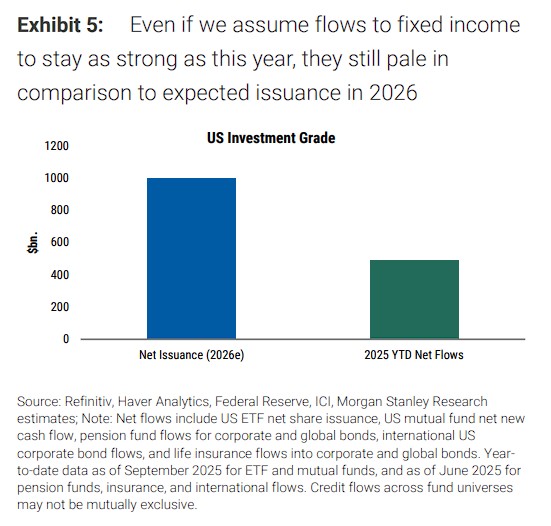 Public Credit Markets: Morgan Stanley expects a significant net issuance of investment-grade (IG) corporate bonds in the U.S. and Europe in 2026, primarily from "hyperscalers" in the AI sector.