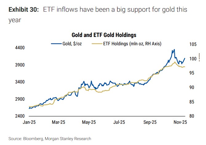 Morgan Stanley prefers metals over energy in the commodities sector, with gold remaining the top choice. The bank has set a target price for gold at $4,500 per ounce, expecting an upside potential of about 9%.
