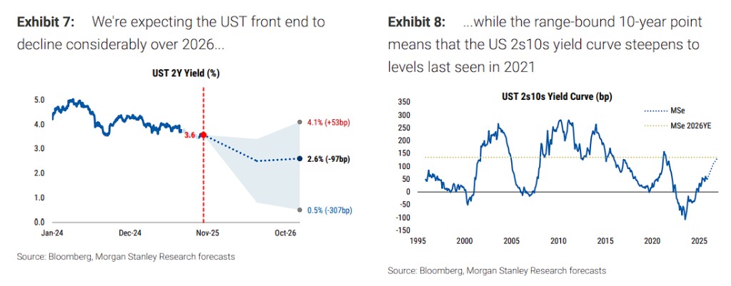 Morgan Stanley expects that as the Federal Reserve cuts rates, short-term yields at the front end of the curve will decline significantly, while long-term yields will remain range-bound.