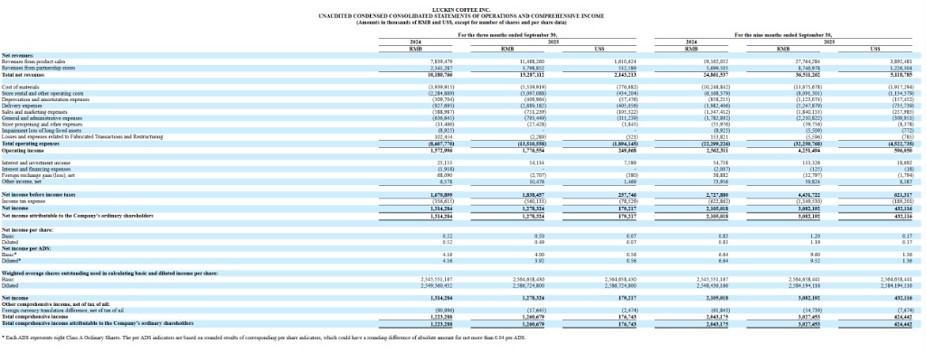 In Q3, Luckin achieved total net revenue of RMB 15.29 billion (same currency), a year-on-year growth of 50.2%, primarily driven by a significant increase in GMV (+48.1%):
