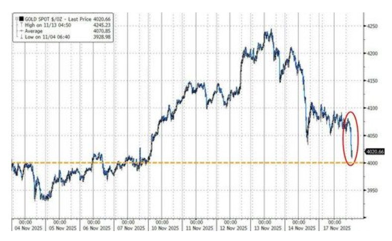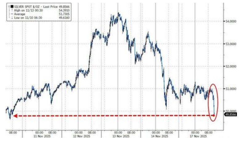 The stock price of cryptocurrency exchange Coinbase also fell sharply by 7.1%. Some market analysts pointed out that Bitcoin's initial decline in Monday's early trading may have acted as a leading indicator dragging down the overall stock market At the same time, gold has also lost its safe-haven aura. According to The Wall Street Journal, some analysts believe that gold's recent trading pattern resembles that of a speculative stock rather than a traditional safe asset. On Monday, spot gold prices fell to around the $4,000 level. Silver prices also plummeted, breaking below the critical $50 mark.