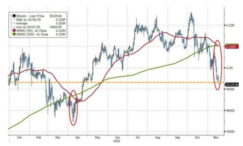 Bitcoin's price plummeted significantly on Monday, falling below the $92,000 mark, erasing all gains for 2025, and its 50-day moving average has crossed below the 200-day moving average, forming a "death cross" technical pattern. Notably, when Bitcoin triggered a death cross in April, it also set a new low for the phase.