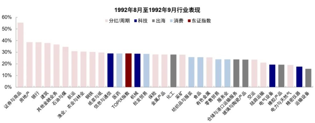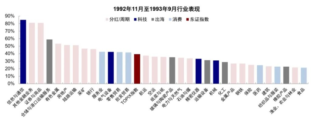 Conclusion: The fundamentals remain weak, and policies fall short of expectations. In September 1993, the Japanese government introduced another stimulus of 6.15 trillion yen, and the Bank of Japan cut interest rates by 75 basis points again, but the fiscal scale was less than before, failing to sustain the stock market's upward momentum. Coupled with the gradual emergence of bank bad debt issues, Japanese stocks turned downward from September 1993, and in the following three months, the Nikkei 225 and the TOPIX indices corrected by 23% and 20%, respectively. During this period, sectors such as information and communication and finance and real estate, which had risen significantly in the previous bull market, led the decline, while retail trade, electricity, and natural gas sectors experienced smaller declines.