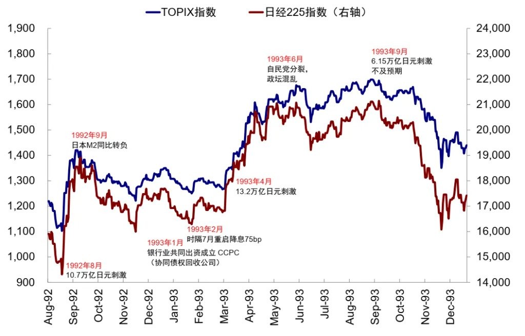 Process: The Tokyo Stock Exchange Index rebounded 54% from the low in August 1992 to the high in September 1993, lasting 12.8 months. This can be divided into three phases: 1) Rapid Surge: Within less than a month after the announcement of the 10.7 trillion yen economic measures in August, the Nikkei 225 and the Tokyo Stock Exchange Index rebounded by 32% and 28%, respectively. 2) Pullback and Fluctuation: Subsequently, in September, Japan's M2 turned negative year-on-year, consumer confidence index accelerated its decline, and the stock market pulled back to November 1992 due to disappointing economic data. 3) Rebound: After about 4 months of fluctuations, the overall index saw a rebound in February 1993 when the Bank of Japan restarted interest rate cuts by 75 basis points after a 7-month hiatus, and in April, the Miyazawa Cabinet introduced a 13.2 trillion yen stimulus, leading to another rebound in Japanese stocks until September 1993.