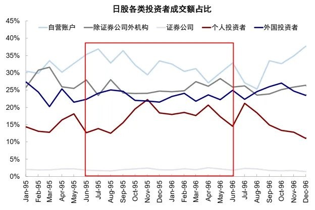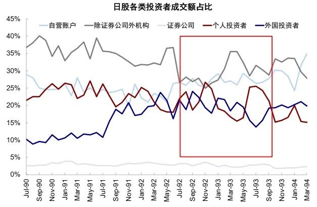 - From the perspective of investor structure, the proportion of individual investors once increased, while the proportion of overseas investors declined, and institutional investors rose. In the early stage of this bull market, Japanese individual investors were quite enthusiastic, with the proportion of individual investors in transaction volume rapidly rising from 18.7% in September 1992 to 26.7% in November. However, during the market turbulence, it fell back to a low of 15.5% in April 1993, and then rebounded again to 25.5% before the end of the bull market in July 1993. In contrast, the transaction proportion of overseas investors initially rose from 18.8% in August 1992 to 24.1% in September, but then continuously declined to 13.8% before the end of the bull market in July 1993. The transaction proportion of institutional investors, excluding brokerages, rose from 25.0% to 33.7%.