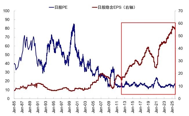 Note: Here, the Japanese stock PE refers to the static P/E of the Datastream Japan All Market Index, with implied EPS calculated based on the price of the Datastream Japan All Market Index Data source: Datastream, China International Capital Corporation Research Department