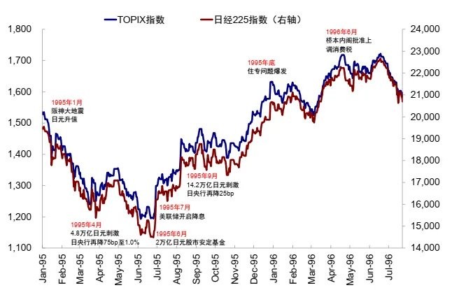 Process: In June 1995, the Japanese government established a "stock market stabilization fund" of about 2 trillion yen, leading to the second round of a bull market in Japanese stocks, which lasted for 12.6 months, during which the Nikkei 225 and the TOPIX rose by 56% and 44% respectively. In the early stages of this bull market, both internal and external environments were favorable for economic recovery and stock market growth. Internally, following the entry of the stock market stabilization fund in June, the Japanese government further injected 14.2 trillion yen in fiscal stimulus in September, and the Bank of Japan cut interest rates by another 50 basis points. Meanwhile, the USD/JPY exchange rate quickly rose from a low of 81 in April 1995 to a high of 105 in September, and the depreciation of the yen stimulated Japanese exports and the rebound of Japanese stocks. Externally, in July 1995, the Federal Reserve began "preemptive" interest rate cuts, creating a loose external environment. Under these circumstances, there were signs of economic recovery in Japan, with the actual GDP year-on-year growth rate rebounding from 1.3% in the first quarter of 1995 to 2.9% in the second quarter, and maintaining above 3% until the third quarter of 1996. The consumer confidence index also rose from 42.1 in September 1995 to 46.9 in June 1996. Japanese stocks continued to rebound until early 1996, during which: