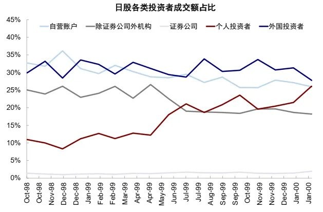 3) The proportion of individual investors in trading volume continues to rise, while the proportion of institutional investors declines, and the trading volume of foreign investors remains relatively stable. The trading volume proportion of individual investors rose from 8.7% before the market rally to 26.1% before the end of the bull market in February 2000, especially showing a significant and rapid increase after June 1999, reflecting a more exuberant market sentiment. In contrast, the proportion of institutional trading (excluding securities) fell from 25% in October 1998 to 18% in February 2000, while the proportion of foreign investors in trading volume remained stable around 30%.