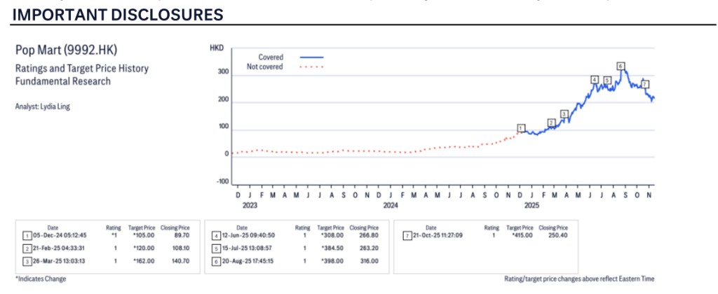 Despite the recent pullback in POP MART's stock price, according to Wind Trading Desk, on November 16, Citigroup reiterated its "Buy" rating for POP MART in a research report, setting a target price of up to HKD 415.00, representing a potential upside of 91.8% compared to the closing price of HKD 216.40 on November 14.