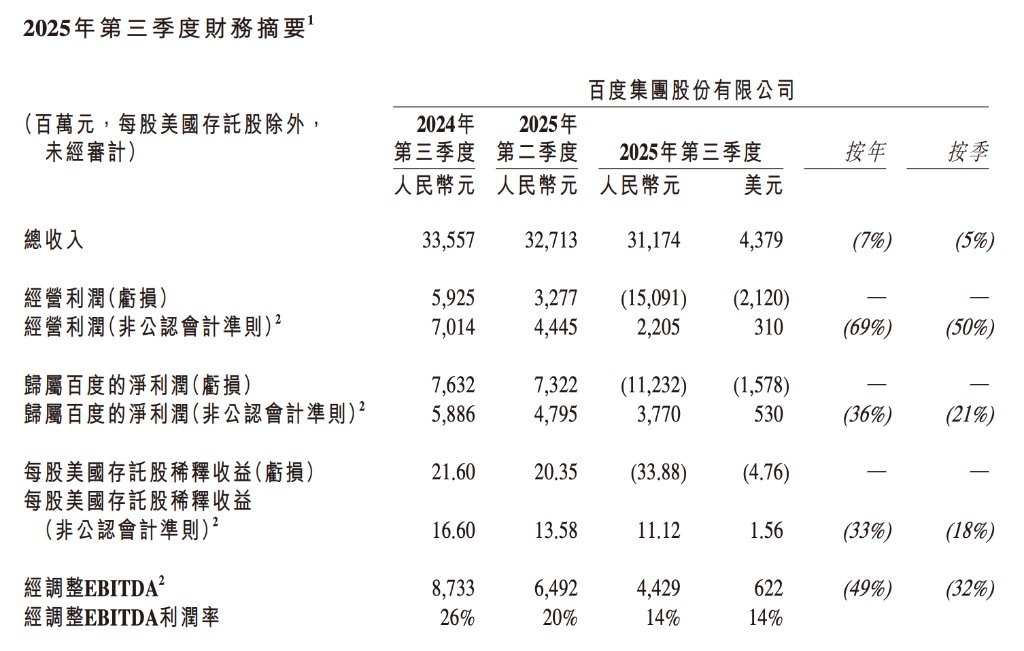 Baidu Q3 revenue is 31.17 billion yuan, a year-on-year decrease of over 7%, with AI business revenue growth exceeding 50% | Financial report insights