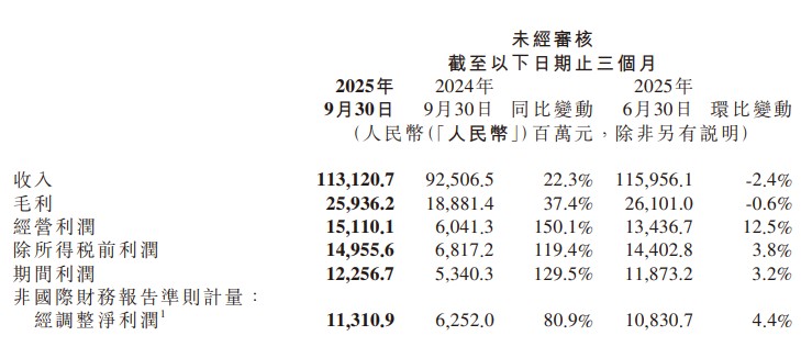 Q3 total revenue was 113.1 billion yuan, a year-on-year increase of 22.3%, and a quarter-on-quarter decrease of 2.4%;