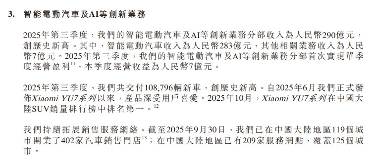 Notably, Xiaomi's smart electric vehicles and AI innovation business segment achieved operational income of 700 million yuan, marking the first time this business recorded a profit.