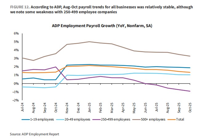 ADP employment wage growth data shows that wage trends for all businesses were relatively stable from August to October, but companies with 250-499 employees showed some signs of weakness.