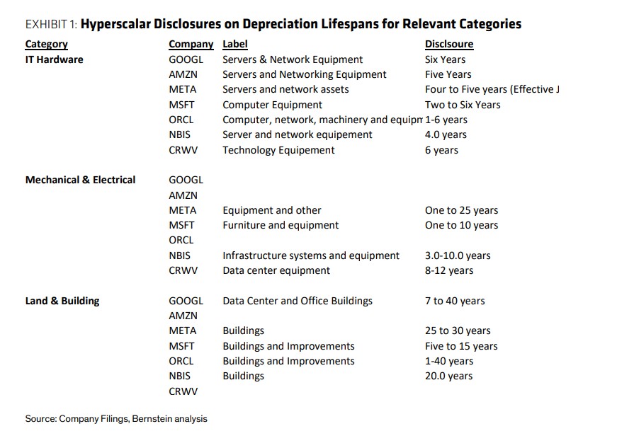 According to company documents, Google has a depreciation period of six years for its servers and network equipment; Microsoft ranges from two to six years; Meta plans to extend the useful life of some servers and network assets to 5.5 years starting in January 2025.