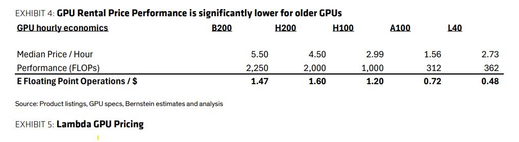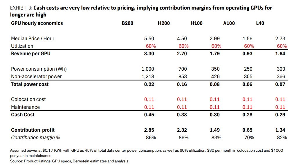Bernstein's analysis breaks down the operational economics of GPUs. The rental prices for GPUs are an order of magnitude higher than their operating cash costs.