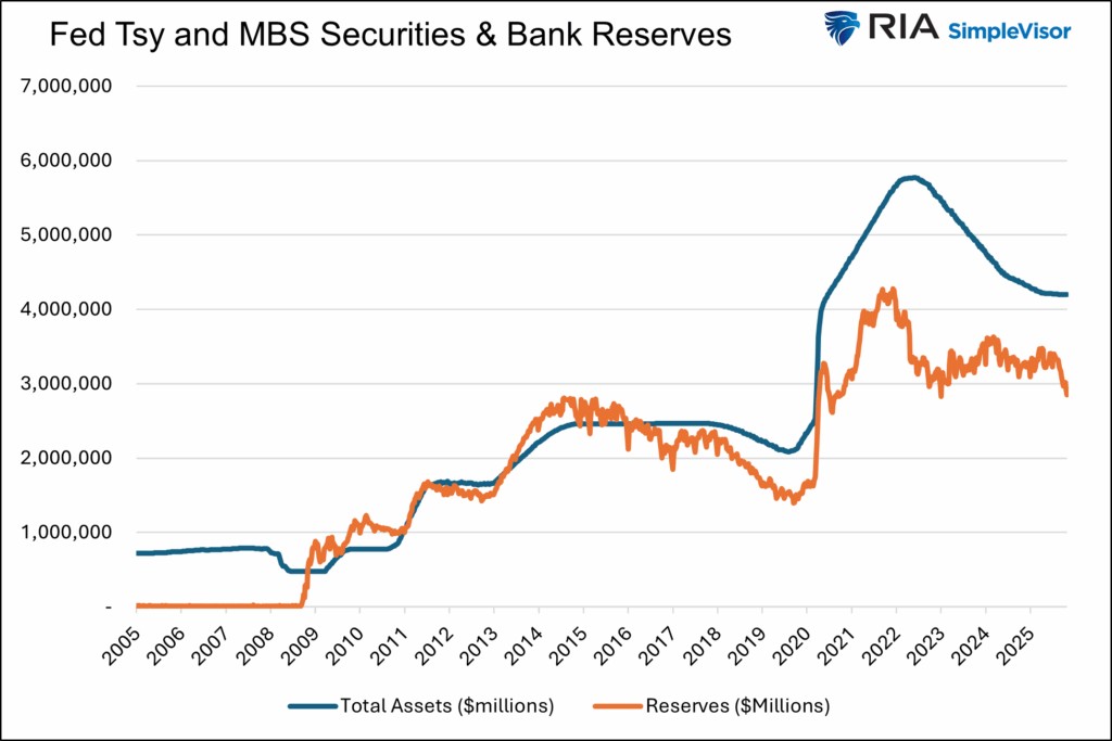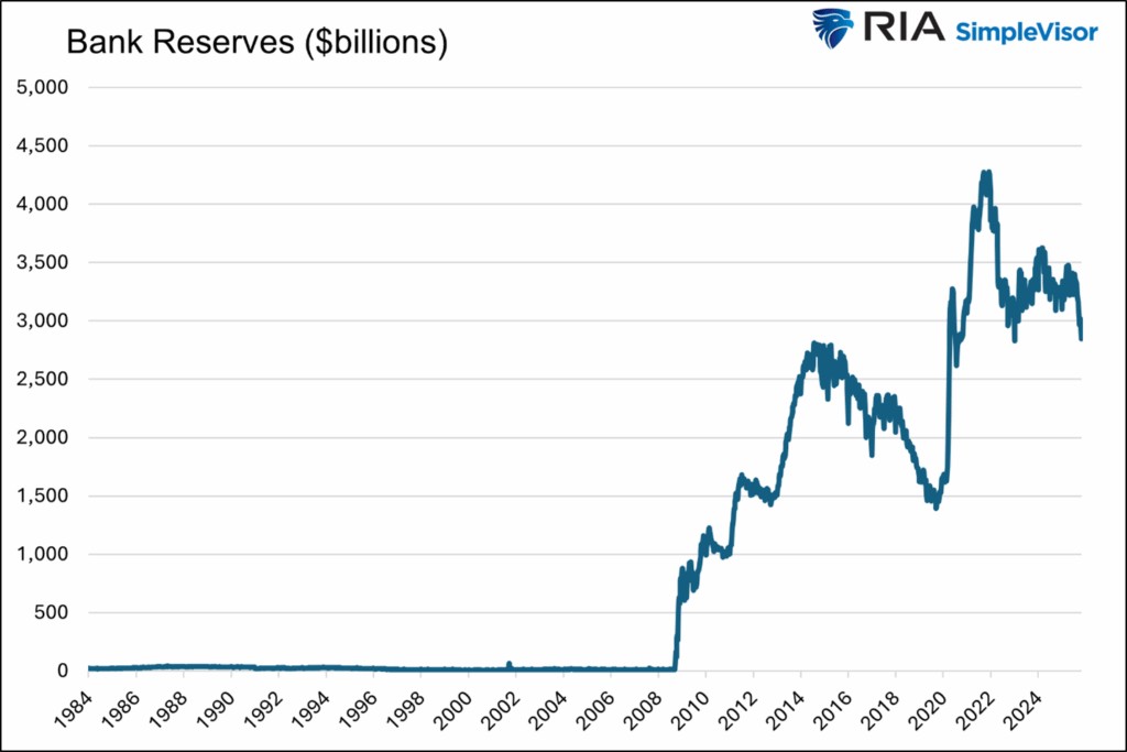 Many repo counterparties that provided liquidity in the pre-2008 era were not banks and thus did not hold bank reserves. Today, with many of those liquidity-providing counterparties unable or unwilling to provide liquidity, liquidity comes from the banks via the Fed. When a bank transacts with the Fed, the Fed either adds or withdraws reserves to the banking system. Thus, when assessing the level of outstanding liquidity, a glance at banking system reserves provides a good gauge. Think of reserves as a footprint of Fed actions.