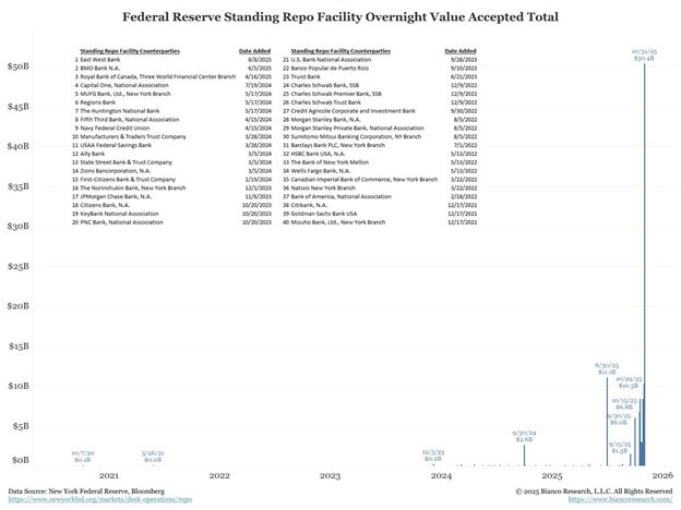 The graph below, courtesy of Bianco Research, shows that the Standing Repo Facility has been used somewhat frequently over the last two months. As we wrote, this is a ceiling of sorts and should be used only when the SOFR market is not functioning properly.
