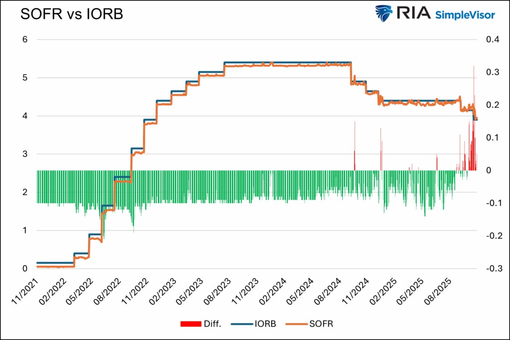 SOFR is the overnight repo rate among non-bank financial institutions. The rate is typically above the ON RRP rate at which institutions can lend to the Fed and below the IORB rate. In ideal liquidity conditions, a bank should decide to lend via the collateralized SOFR markets when the SOFR rate exceeds the IORB rate. When SFOR is above IORB and they don’t, it signals there is a liquidity shortfall or some other reason why banks are unwilling to increase profits without taking on risks. As shown below, SOFR has been steadily trading above IORB since October.