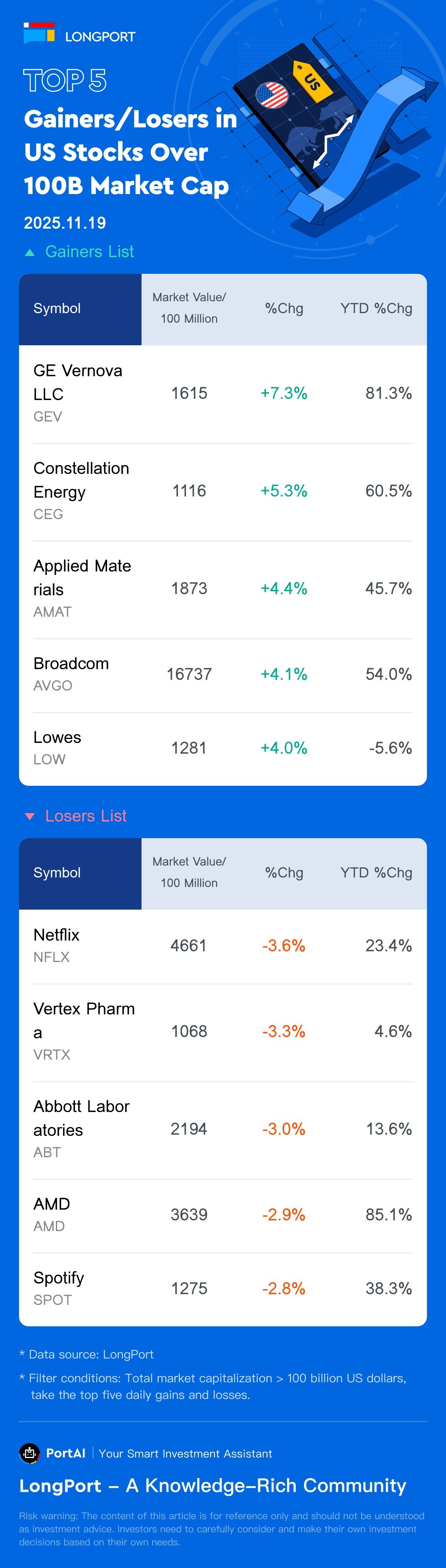 Top 5 US Stock Gainers/Losers (>100B) (11.19)
