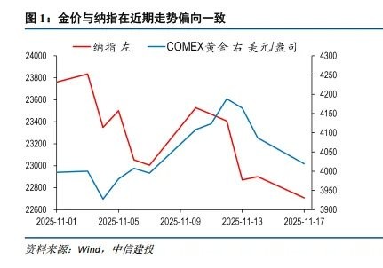 Since November, gold prices and the Nasdaq have repeatedly shown simultaneous rises and falls. As the two belong to safe-haven and risk assets, their rising correlation has raised market concerns about deeper risks. For example: On November 4, the Nasdaq fell by 2%, and gold fell by 1.8%; on November 10, the Nasdaq rose by 2.3%, and gold rose by 2.8%; on November 13, the Nasdaq fell by 2.3%, and gold fell by 0.6%; on November 17, the Nasdaq fell by 0.8%, and gold fell by 1.6%.
