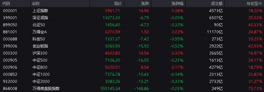 The Shenzhen Component Index closed at 13073.30 points, down 0.05%.