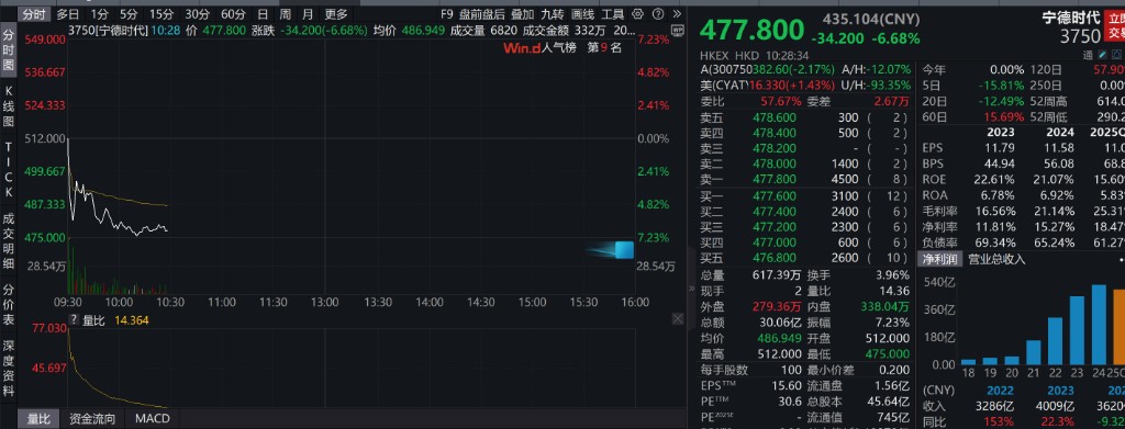 Contemporary Amperex Technology Co., Limited's Hong Kong stock came under pressure and fell 6.68%.