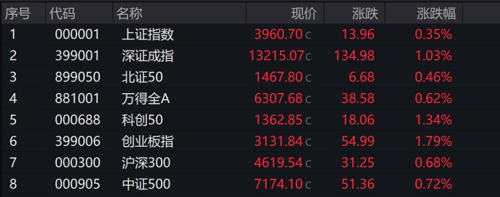 The Shenzhen Component Index opened at 13215.07 points, up 1.03%.