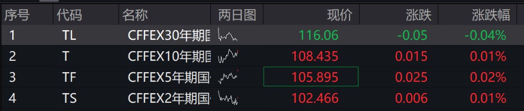 Government bond futures opened mixed, with the 30-year main contract down 0.04%, the 10-year main contract flat, the 5-year main contract up 0.03%, and the 2-year main contract up 0.01%.