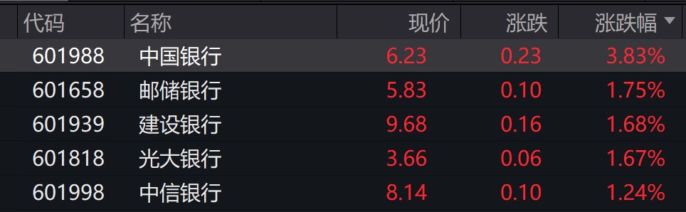 A-share bank stocks continued to strengthen, with Bank of China rising over 4%, the stock price reaching a new historical high, and the total market value exceeding 2 trillion yuan. Postal Savings Bank, China Everbright Bank, China Construction Bank, and China CITIC Bank saw significant gains.
