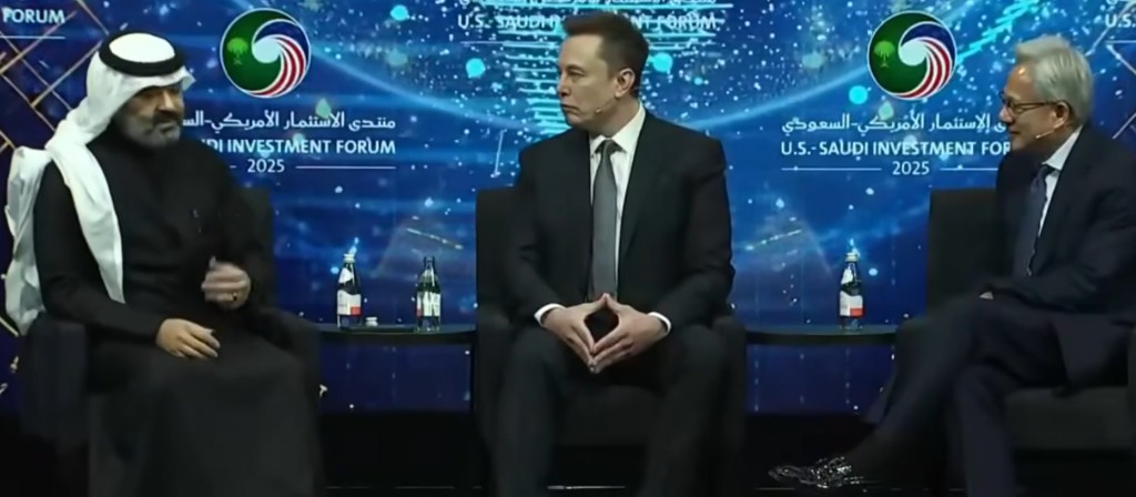 Please take your seats. We should give a more enthusiastic round of applause for one of the greatest leaders in history. That said, the topic we are discussing today involves a market capitalization scale that has reached 7 to 8 trillion dollars (I can’t even count it), but we are gathered here to celebrate a historic moment — that is, the scene from last night's dinner Thank you all for being here with the support of His Excellency the President and His Royal Highness Crown Prince Mohammed. Last night, we were fortunate to hear an important message: this is the greatest alliance between the Kingdom of Saudi Arabia and the United States. In the past, you helped us build an energy-based economy, powering the industrial age; and now, we are rapidly stepping into the intelligent era, providing support for fields such as artificial intelligence factories, robotics, and autonomous flying vehicles. Speaking of which, Elon, if you don’t mind, let’s start with you, and Jensen can add his comments at any time.