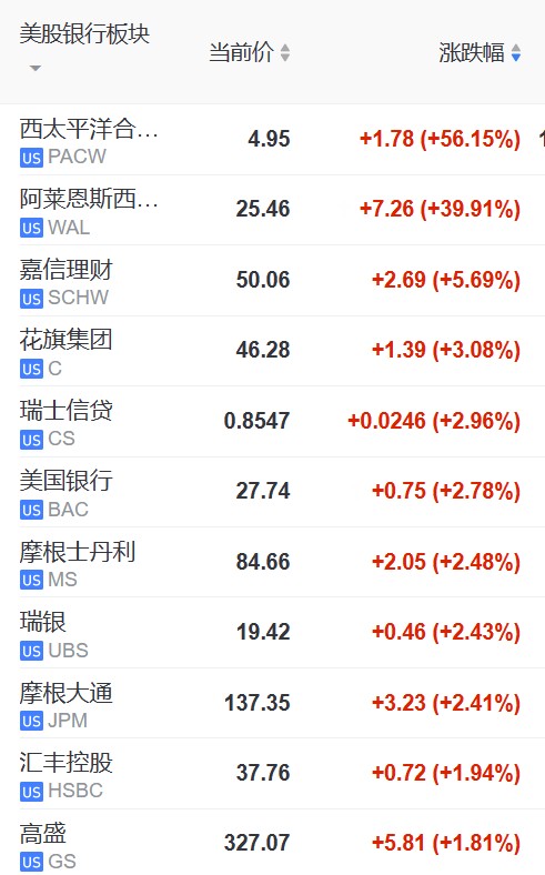 部分區域性銀行股走高,西太平洋合眾銀行漲超 56%,阿萊恩斯西部銀行漲近 40%。