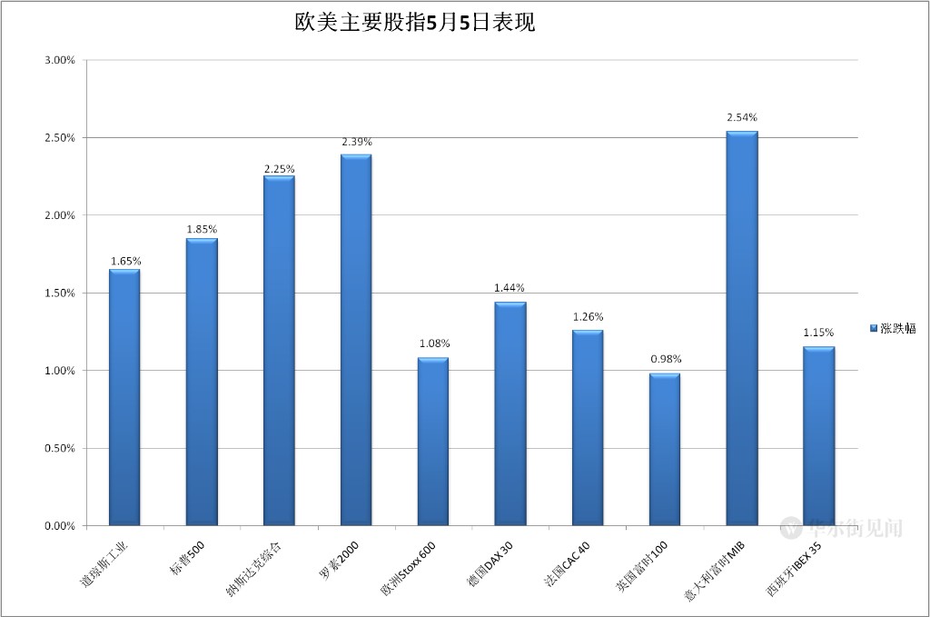 連續兩日刷新 4 月 26 日上週三以來低位的納指收漲 2.25%,報 12235.41 點,刷新上週五所創的去年 9 月 12 日以來新高。標普收漲 1.85%,和納指均創上週四以來最大漲幅,報 4136.25 點,在連續兩日創 4 月 26 日以來新低後,未繼續逼近 4 月 26 日所創的 3 月 30 日以來收盤低位。道指收漲 546.64 點,漲幅 1.65%,刷新上週四所創的 1 月 6 日公佈 12 月美國非農就業報告當天以來最大漲幅,報 33674.38 點,告別週四所創的 3 月 30 日以來收盤低位。