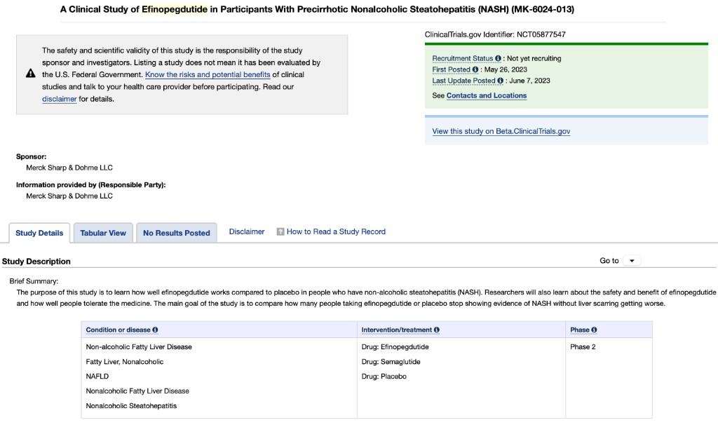 稍早時候,默沙東在 6 月 7 日更新了 Clinicaltrials 上Efinopegdutide 在 NASH 適應症上的 2b 期臨牀試驗設計方案。