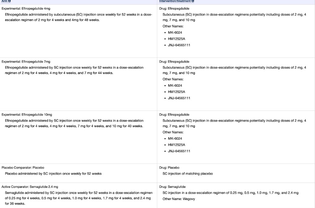 根據方案,2b 期將入組 300 人。值得注意的是,默沙東為 Efinopegdutide 選擇了兩個對照組,一組是常規的安慰劑,另一組則是大名鼎鼎的司美格魯肽。