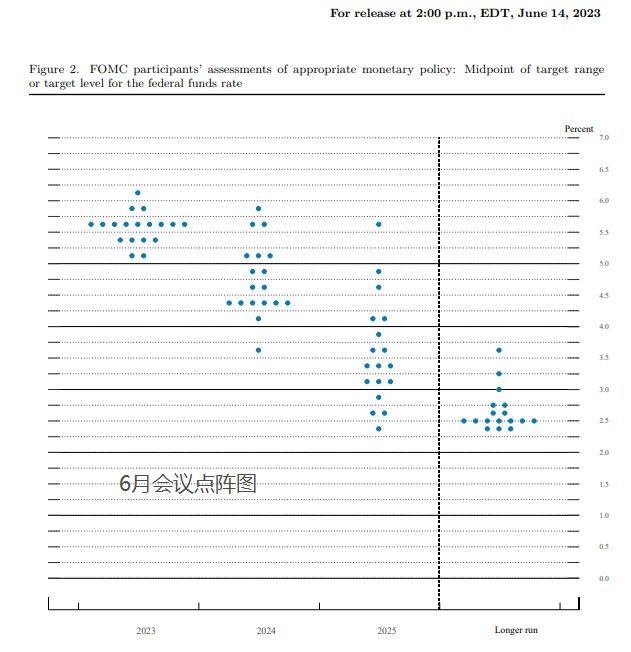 此次會議更新的點陣圖還顯示,18 名聯儲官員中有 16 名預計到今年末利率將高於 5.25%,3 月時這一數量還只有 7 名。這就意味着他們希望未來能夠進一步提高利率。
