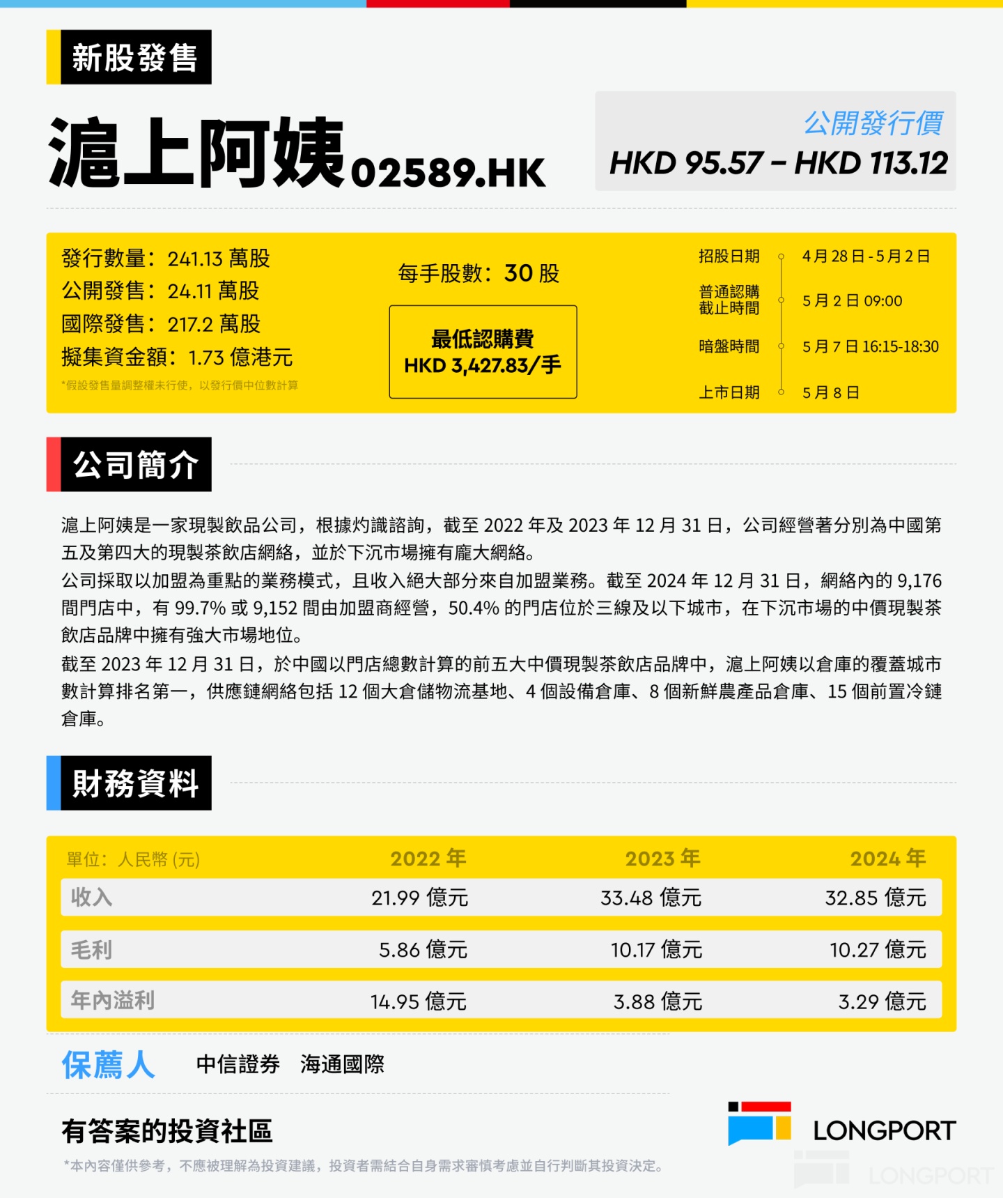- Valuation Reference: Based on the 2024 P/E ratio (calculated with 2024 net profit of CNY 329M), it is about 30x (at the median offering price), compared to the industry leader $MIXUE GROUP(02097.HK) with a current dynamic P/E of around 20x.