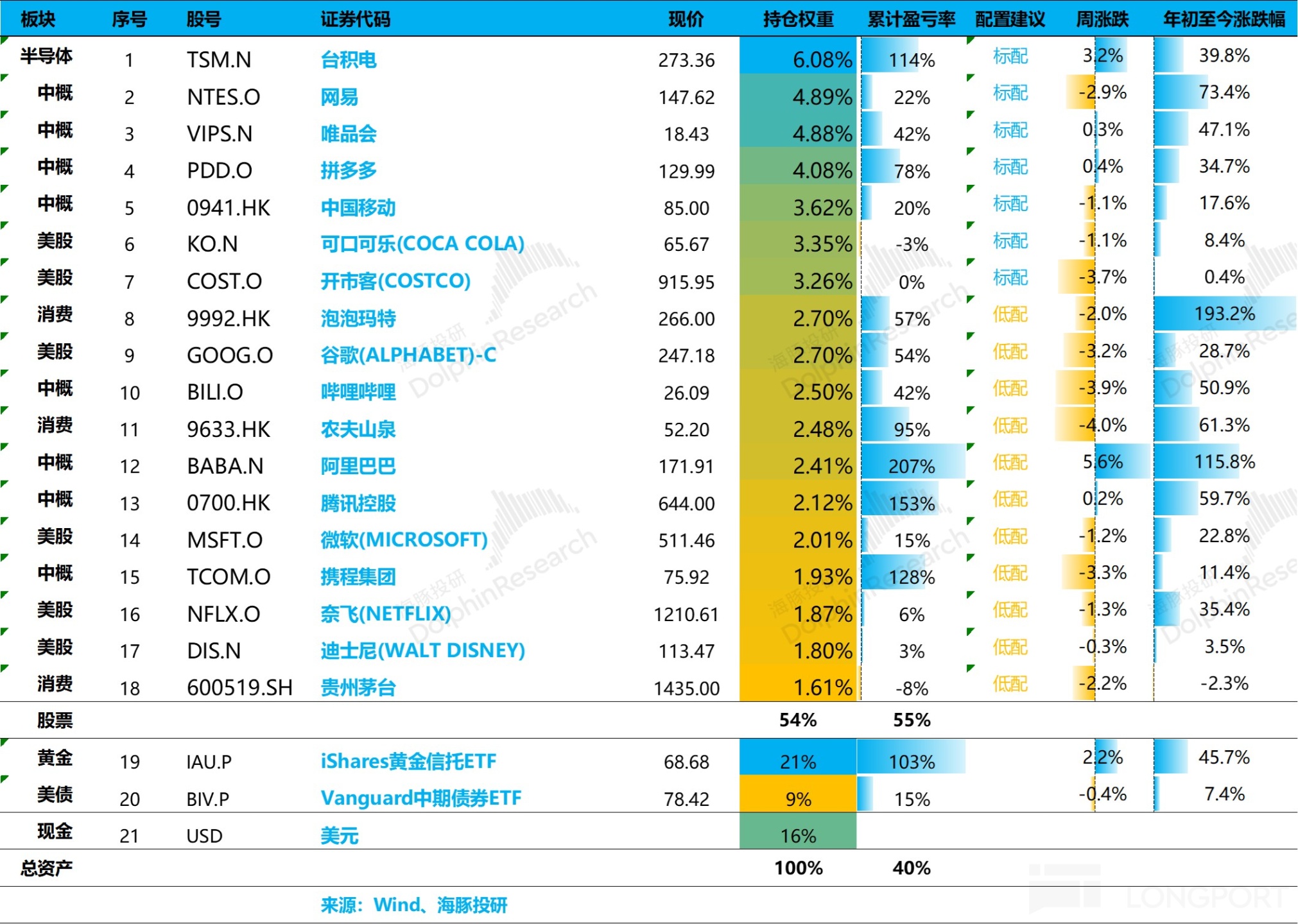 The Alpha Dolphin virtual portfolio holds a total of 18 stocks and equity ETFs, with 7 standard allocations and the rest underweight. Assets outside of equities are mainly distributed in gold, U.S. Treasuries, and U.S. dollar cash, with the current ratio between equity assets and defensive assets like gold/U.S. Treasuries/cash being approximately 55:45.