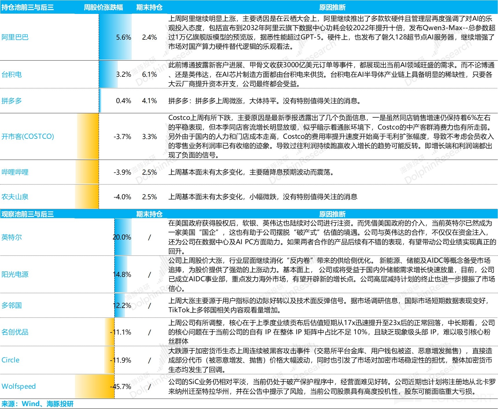 Last week, Dolphin Research's virtual portfolio Alpha Dolphin declined mainly due to the pullback of Chinese concept stocks like NetEase and Bilibili, while U.S. stocks like Costco weakened due to performance, dragging down equity asset performance. However, the gold weighting in the portfolio rose due to the risk of a U.S. government shutdown, offsetting the equity asset pullback.