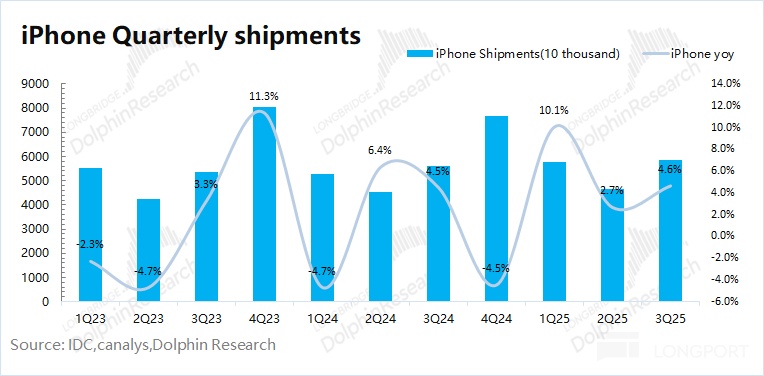① Short-term: Mainly focusing on the shipment performance of the iPhone 17 series. Dolphin Research believes that the "more for less" operation will drive phone sales. The guidance given by the company for the next quarter also reflects the good performance of the iPhone 17 series, while the market's expectation for the full-year shipment volume was only about a 3% year-on-year increase;