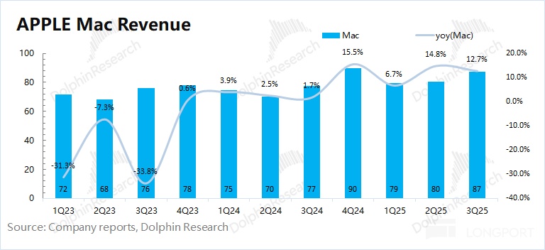 In Q4 FY2025 (i.e., 3Q25), Mac business revenue was $8.7 billion, up 12.7% year-on-year, slightly better than market expectations ($8.5 billion).