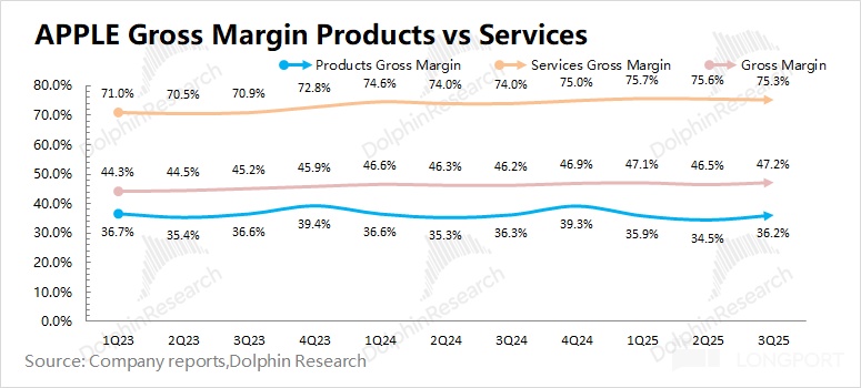 Apple's software gross margin this quarter remained at a relatively high level of 75.3%, which was the main source of the company's gross margin improvement this quarter. The hardware gross margin remained at 36.2%, with tariff-related costs impacting approximately $1.1 billion this quarter. Excluding this impact, the company's hardware gross margin this quarter would be about 37.7%, actually up 1.4 percentage points year-on-year.