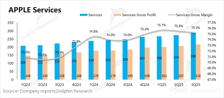4. Software Services: The company's software services revenue this quarter was still $28.8 billion, better than the market consensus ($28.2 billion). With a high gross margin of 75.3%, the company's software business, accounting for 28% of revenue, generated 45% of the company's gross profit.