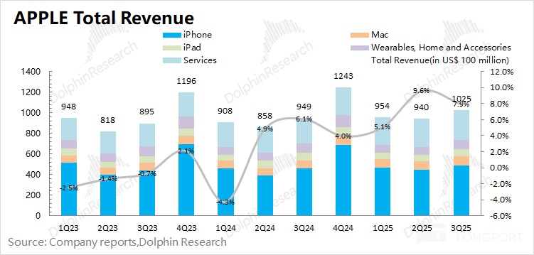 1.1 Revenue: In Q4 FY2025 (i.e., 3Q25), Apple achieved revenue of $102.5 billion, up 7.9% year-on-year, in line with the market consensus ($102 billion). The company's revenue growth this quarter was mainly driven by the growth of iPhone, Mac, and software services, while iPad and wearables and other hardware businesses remained relatively weak.