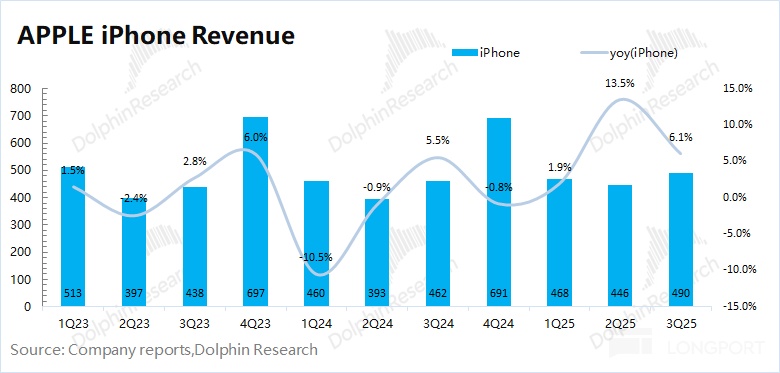 In Q4 FY2025 (i.e., 3Q25), iPhone business revenue was $49 billion, up 6.1% year-on-year, slightly below market expectations ($49.3 billion). The growth in the company's iPhone business this quarter was mainly driven by the launch of the iPhone 17 series and the growth in demand from emerging markets.