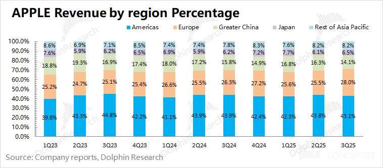 5. Revenue by Region: The Americas remained the company's core market, with a revenue share of 43%, achieving a 6.1% year-on-year growth this quarter; Greater China was the only region with a year-on-year decline in revenue this quarter, mainly due to the impact of state subsidies and the delayed launch of the iPhone Air.